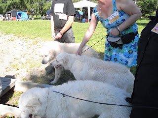 igår tillbringade vi nästan hela dagen på hundutställning. Det var Kuvasz-specialen med ca 70 Kuvaszar på plats. Vi är inga utställningsmänniskor, har bara ställt ut två gånger tidigare och då mest för att vår uppfödare skulle få ett omdöme på Asta. Båda gångerna fick vi hjälp att "ställa" henne inför domaren. Mycket proffsig hjälp men Asta kände sig inte jättebekväm varken med honom eller i ringen, det märktes. Dock brukar det vara roligt att träffa Astas syskon, speciellt Tora och hennes trevliga matte S. Och så förstås Astas uppfödare A och P, underbara människor.